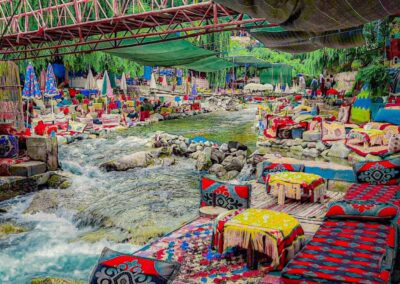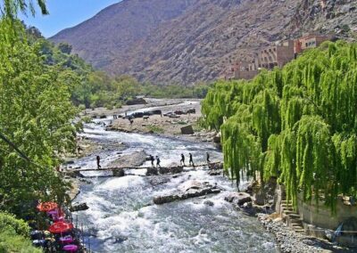 As the road follows the serene Ourika River, fertile fields, olive groves, and walnut orchards frame the journey toward the picturesque village of Setti Fatma. From here, travelers have the option to hike through shaded trails up to the Setti Fatma waterfalls, marveling at each cascading tier and the surrounding natural beauty. For those seeking a more relaxed experience, riverside cafés offer the chance to enjoy a traditional Berber tagine while soaking in the tranquil surroundings.